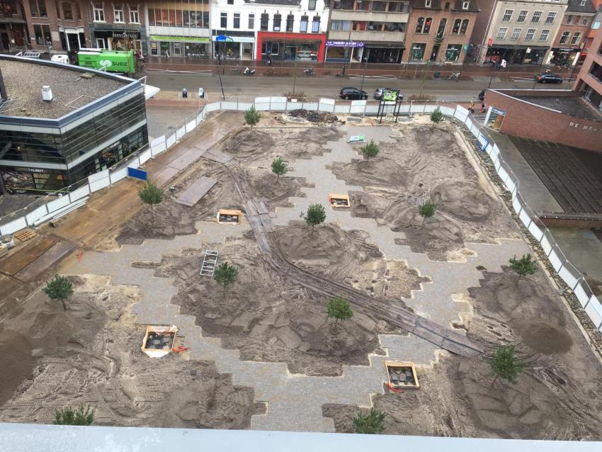 De afbeelding laat de herinrichting van het Prins Clausplein zien. Veel ruimte voor groen, hergebruikte tegels en bankjes van circulaire materialen.